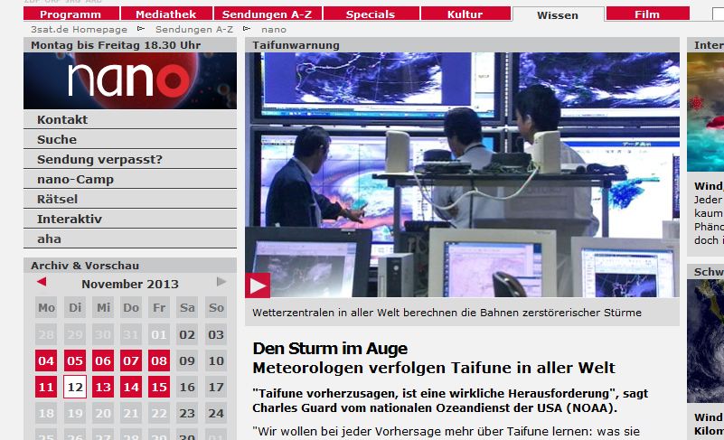 nano Taifun heuteHeute noch einmal die Kurzfassung des Taifunsfilmes (Erstsendung 2008 bei arte). Hier die Langfassung als Ansehkopie. Hoffentlich kommt die Hilfe für die Menschen im Katastrophengebiet langsam an. Die US Navy schickt Schiffe und Hubschrauber wie einst 1959 im Kampf gegen den Taifun „Vera“ (im arte – Film ausführlich gezeigt)