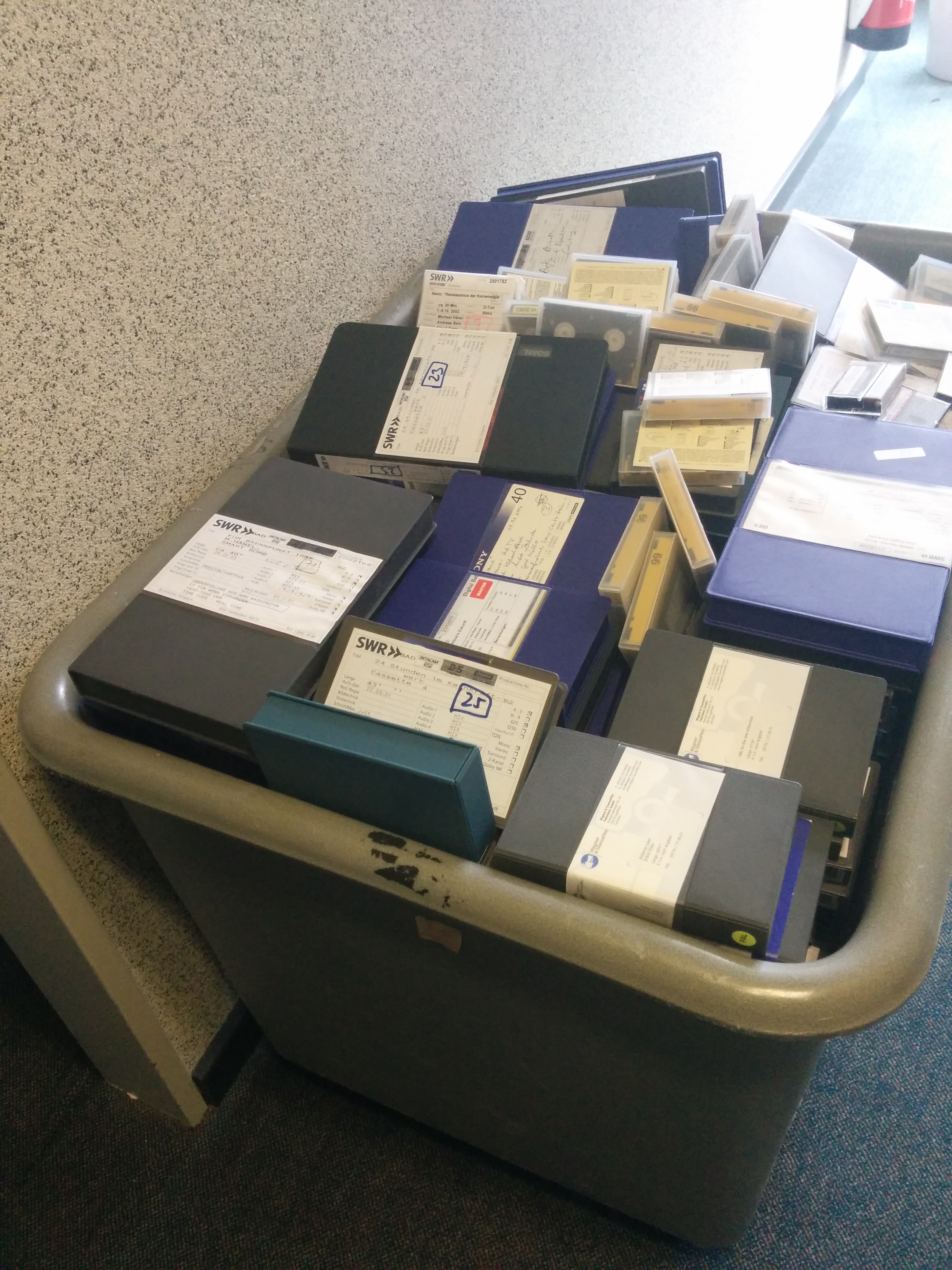 In diesen Tagen wird mein Büro renoviert. Eine gute Gelegenheit, die vielen analogen und vor-digitalen Bänder, auch DVCpro etc. aus Drehs seit 1999 zu verabschieden. Tolle Themen waren das: die Zeiten sind über sie hinweggegangen. Ein wenIMG_20140428_113425ig Wehmut, klar. Aber vor allem großen Dank an alle Kameraleute und Cutter, die diese Zeit begleitet haben, an so vielen Orten dieser Welt.