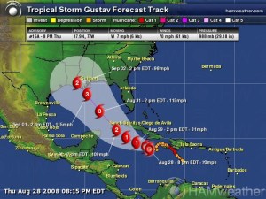 das haben wir in den Nachrichten gesehen. Doch da ist ostwärts noch ein Wirbelsturm: „Hanna„, bisher mit geringerer Ausdehnung. „Hanna“ zieht in Richtung „Gustav“. Der Tanz der Wirbelstürme nimmt Ihnen gegenseitig die Kraft: sagt der sogenannte „Fujiwara-Effekt„. Wird Hanna Gustav zügeln und die Stadt retten? YouTube hat ein Video [der Webseite digital-typhoon.com] des Fujuwara – Effekts der mehrerer Taifune im Juli 2006. Mehr dazu gefunden: